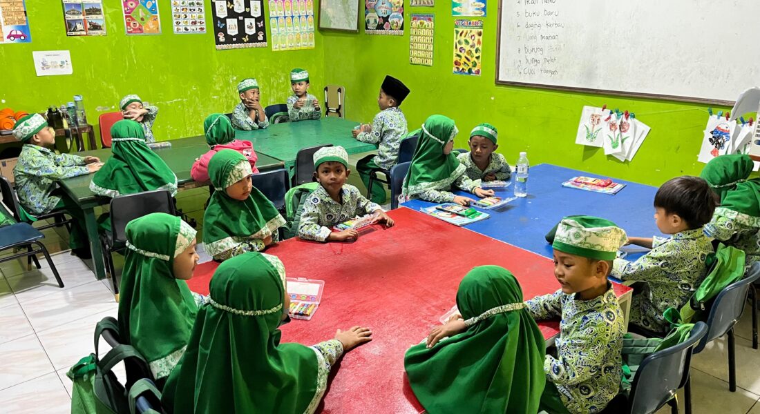 Suasana kebersamaan siswa RA Raudlatul Qur’an 01 Batam saat bermain dan belajar di dalam kelas, mencerminkan lingkungan belajar yang menyenangkan dan sesuai dengan nilai-nilai Islam.