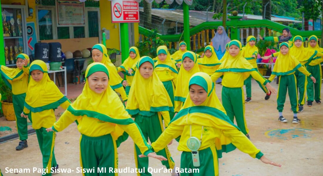 Suasana penuh semangat terlihat di halaman MI Raudlatul Qur’an Batam saat anak-anak mengikuti kegiatan senam pagi bersama. Dengan seragam olahraga berwarna hijau kuning yang cerah, para siswa tampak antusias mengikuti setiap gerakan senam yang dipandu oleh guru.