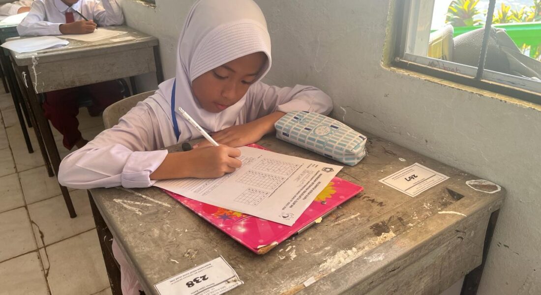Seorang siswi sedang fokus mengerjakan soal ujian di kelas. Suasana ruang ujian tampak tertib dan kondusif, mendukung konsentrasi seluruh peserta didik.