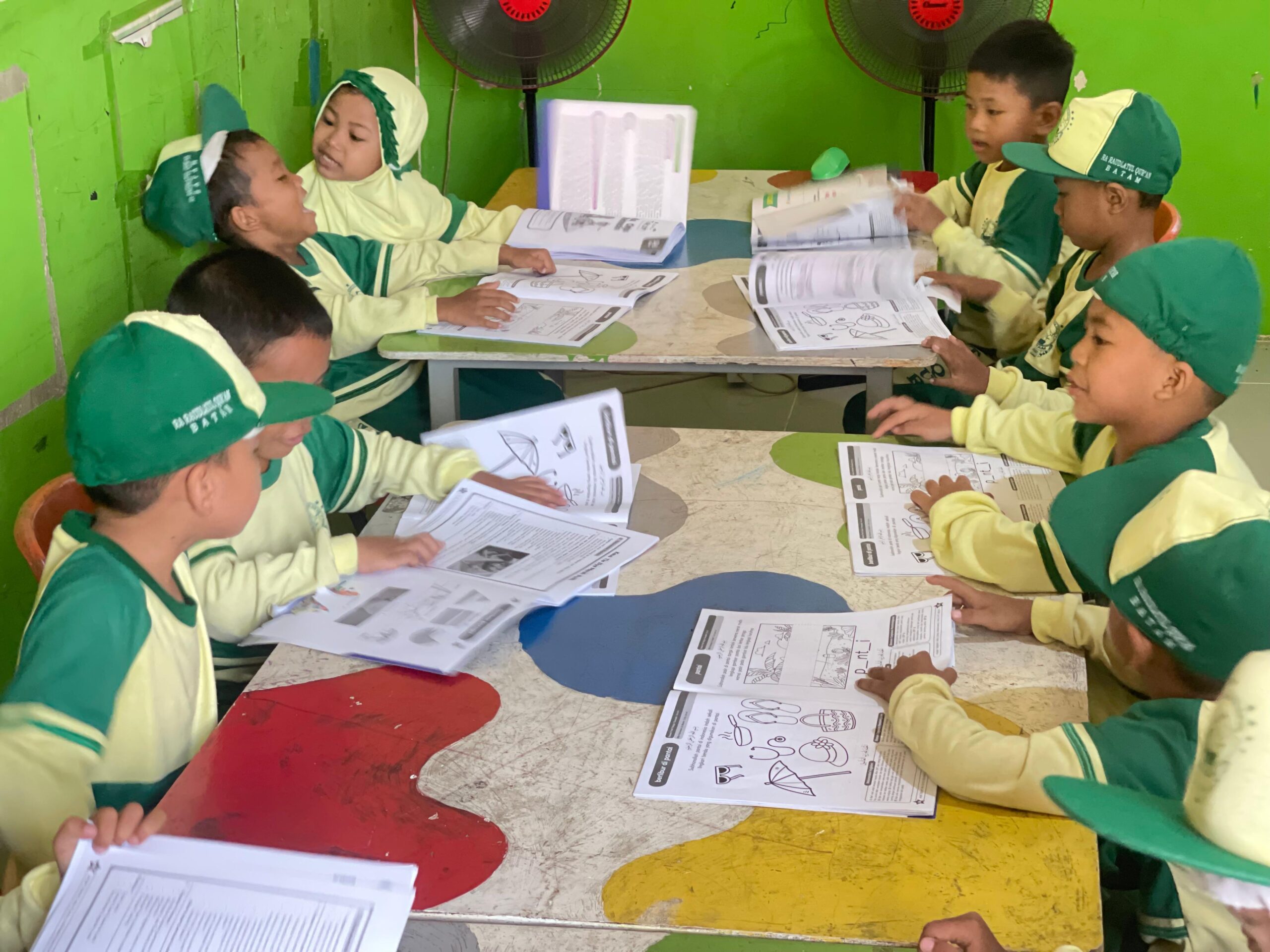 Anak-anak belajar menulis dan menggambar dengan semangat di dalam kelas, dibimbing dengan sabar oleh para ibu guru .