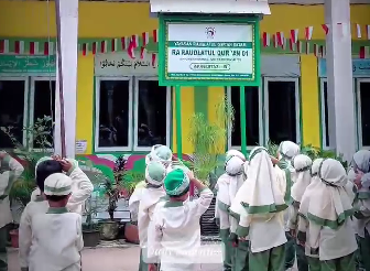 Tampak anak-anak RA Raudlatul Qur’an 01 Batam sedang mengikuti kegiatan upacara pagi di halaman sekolah