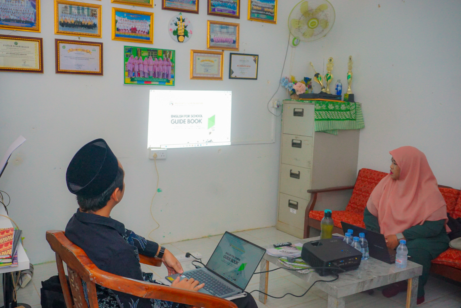 Guru MI Raudlatul Qur’an Batam tengah memberikan penjelasan materi pelajaran kepada siswa di dalam kelas.