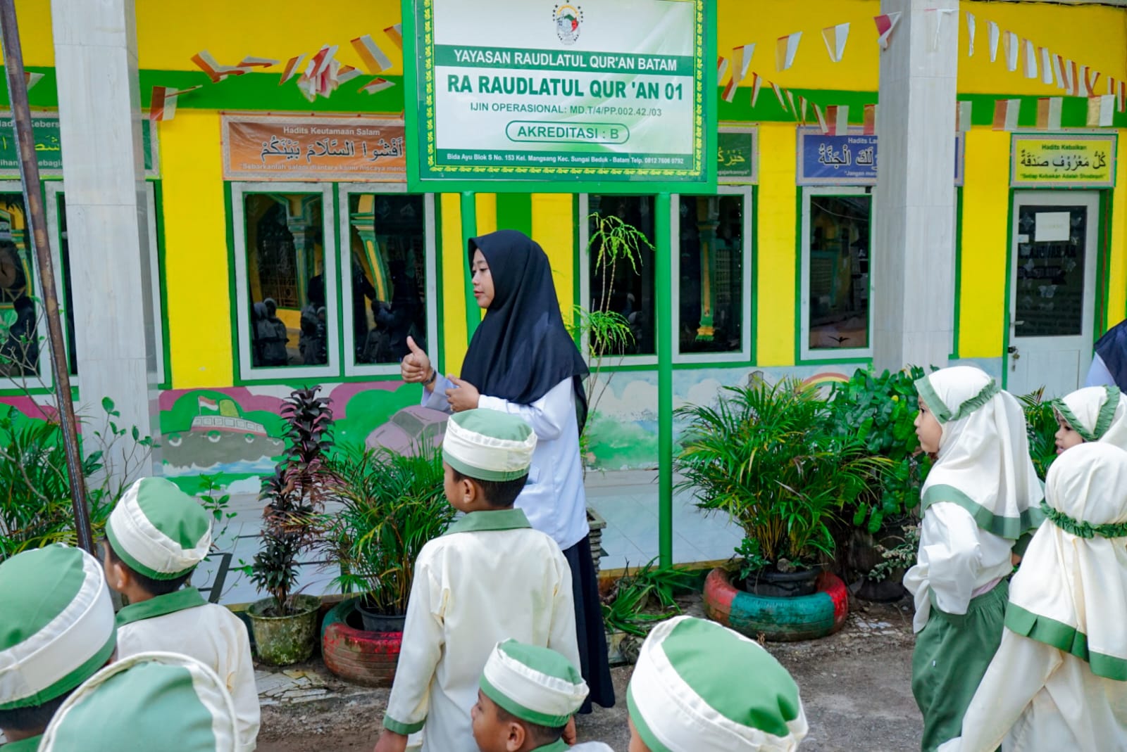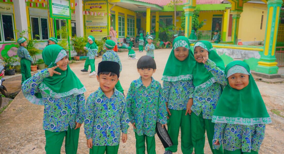 Siswa-siswi RA Raudlatul Qur’an 01 Batam tampak ceria dan penuh semangat mengikuti kegiatan pembiasaan islami. dihalaman sekolah