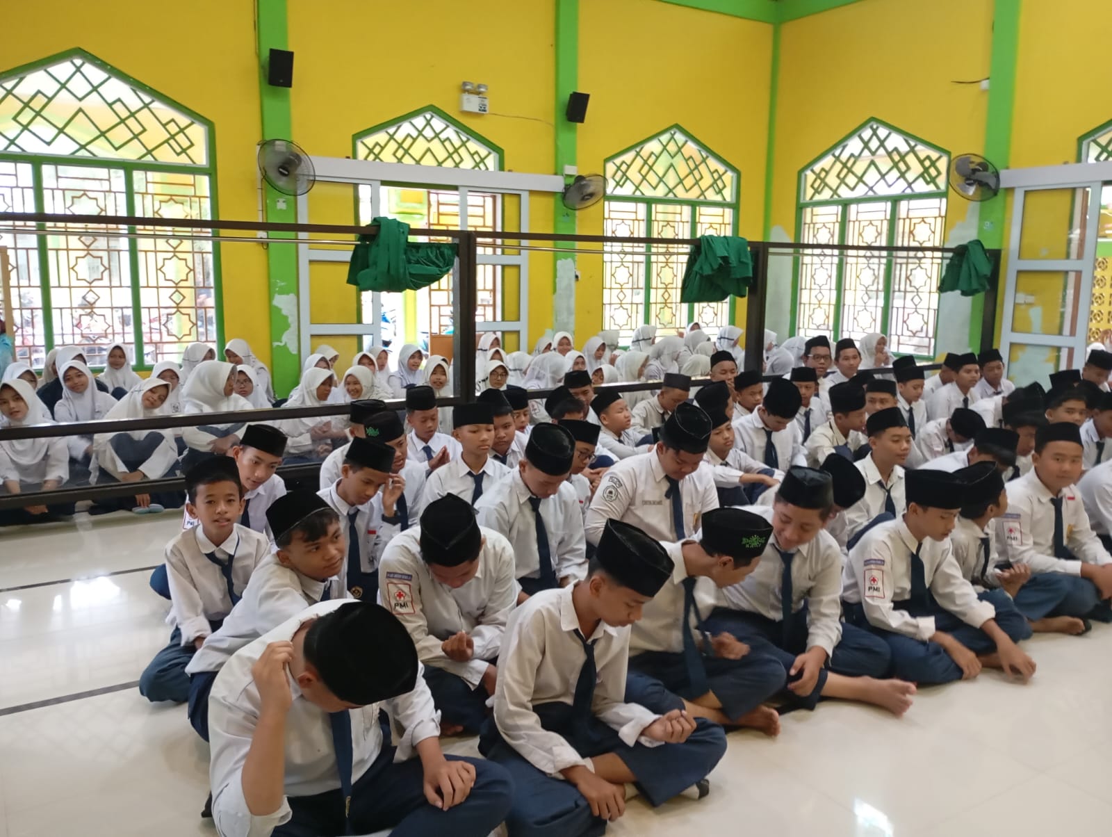 Siswa putra MTs Raudlatul Qur’an Batam memenuhi ruangan utama, menunjukkan kekompakan dan keseriusan selama pelaksanaan kegiatan doa bersama.