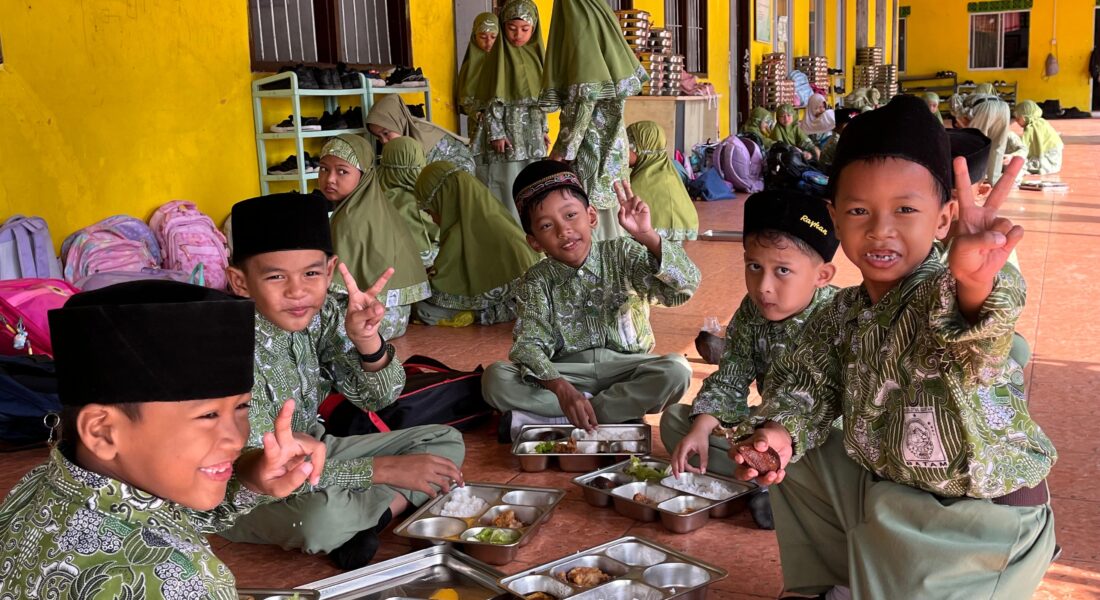 Siswa MI Raudlatul Qur’an Batam tampak ceria saat menikmati kegiatan makan bersama di lingkungan sekolah, menunjukkan kebersamaan dan keakraban antar teman.