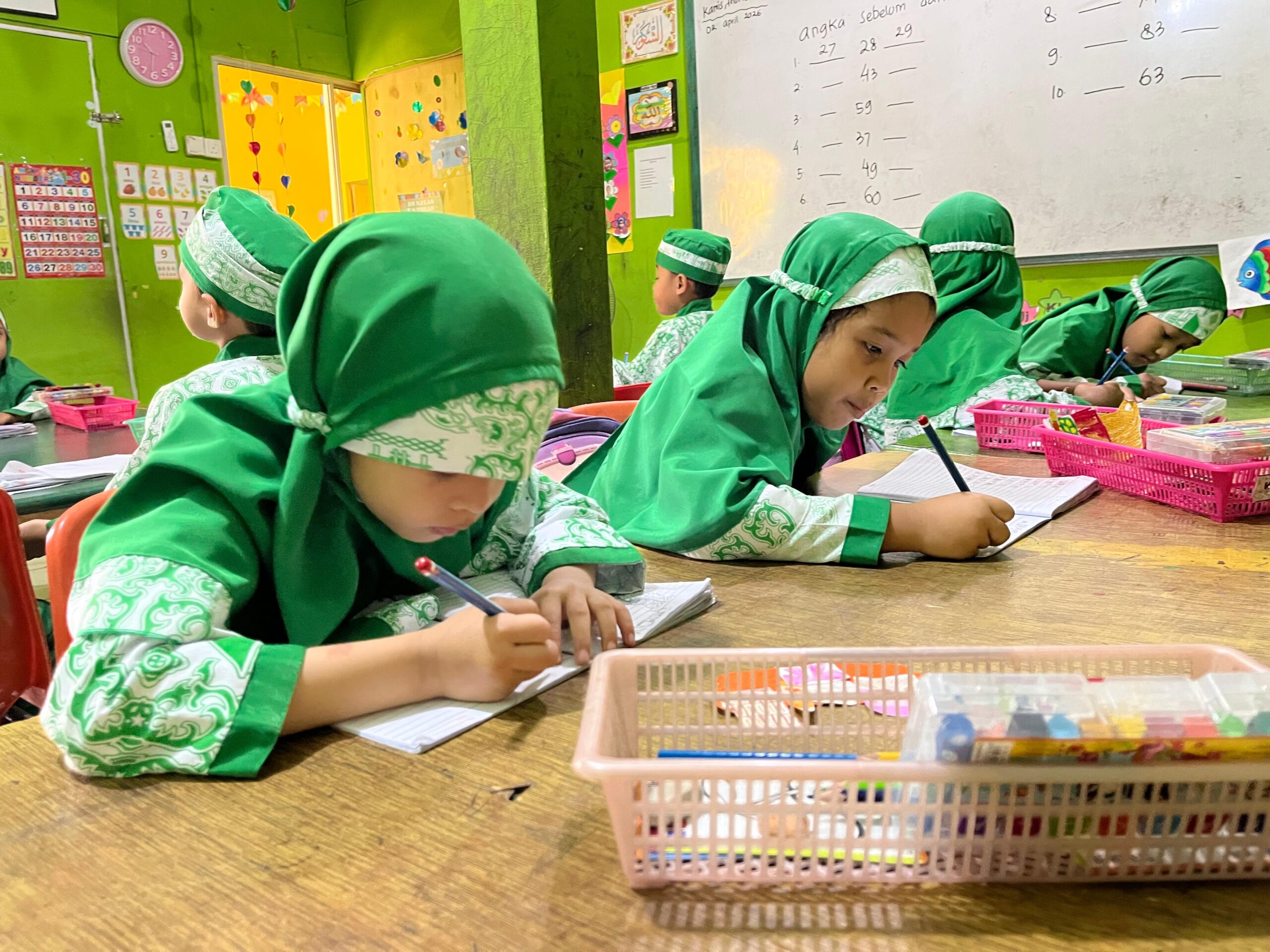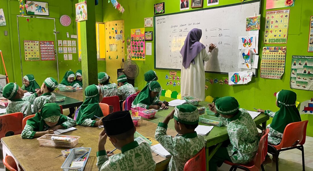Guru RA Raudlatul Qur’an 01 Batam sedang memberikan materi pembelajaran di depan kelas, sementara siswa tampak fokus dan aktif mengikuti kegiatan belajar dengan penuh semangat.Kegiatan pembelajaran di RA Raudlatul Qur’an 01 Batam berlangsung dengan penuh semangat dan suasana yang menyenangkan. Para siswa tampak antusias mengikuti proses belajar mengajar yang dipandu langsung oleh guru di dalam kelas.