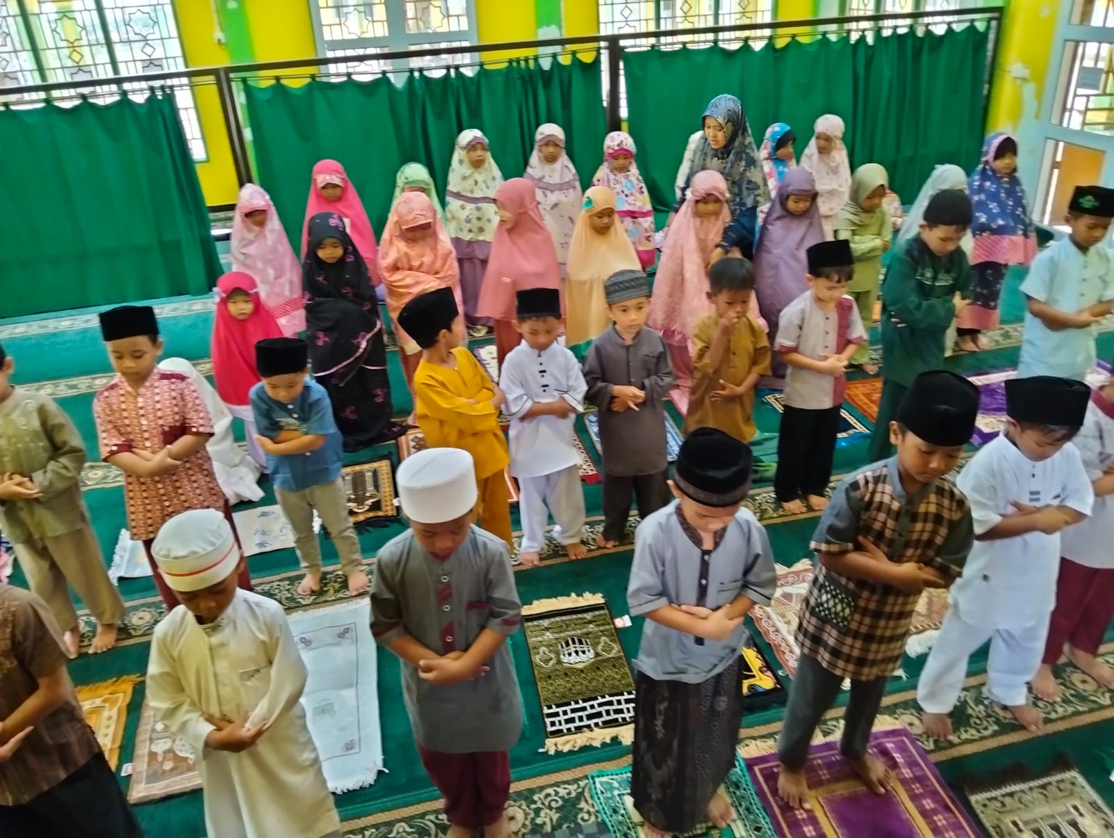 Dengan bimbingan guruh, anak-anak belajar mulai dari niat, tata cara berdiri yang benar, gerakan rukuk, sujud, duduk di antara dua sujud, hingga salam. Sebelum praktik dimulai, ustazah memberikan penjelasan sederhana tentang keutamaan Sholat Dhuha sebagai sholat sunnah yang membawa keberkahan dan rezeki.