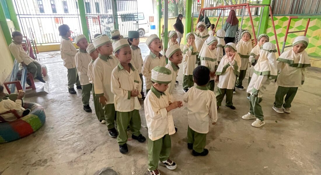 Anak-anak RA Raudlatul Qur’an 02 Sagulung Batam berbaris dengan rapi sebelum kegiatan belajar dimulai.
