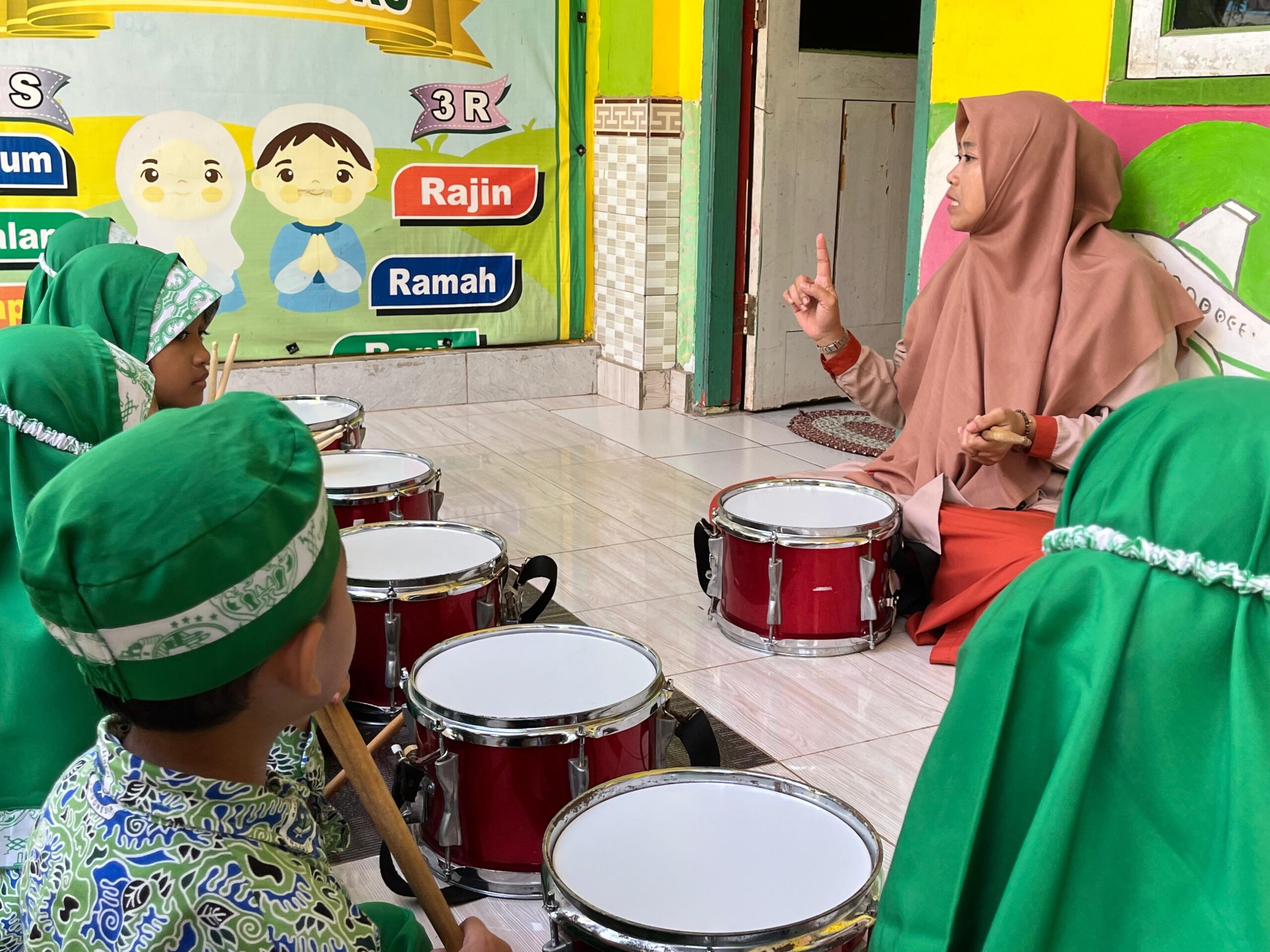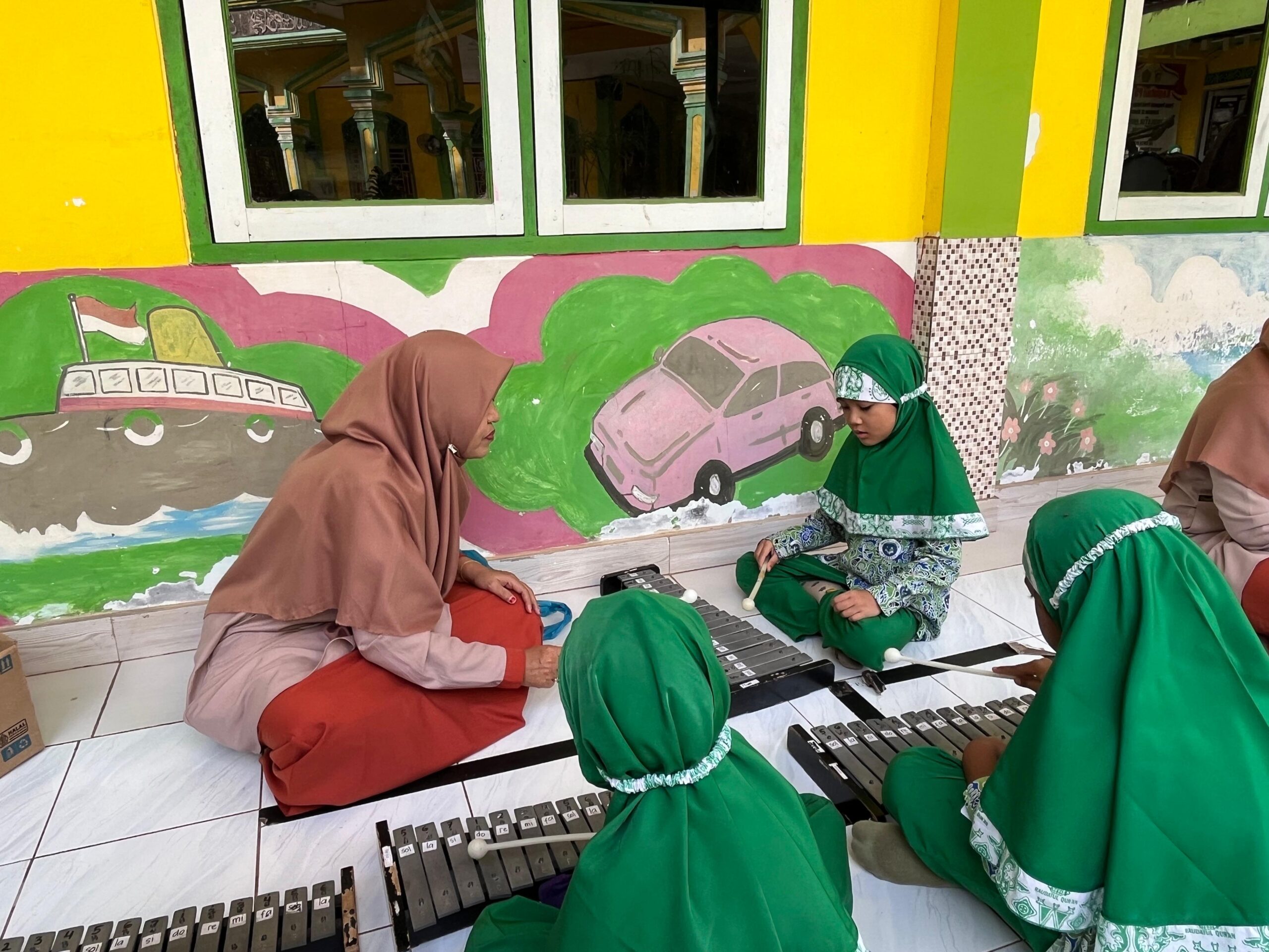 Siswa RA Raudlatul Qur’an 01 Batam belajar memainkan alat musik sederhana dengan penuh antusias didampingi oleh guru.
