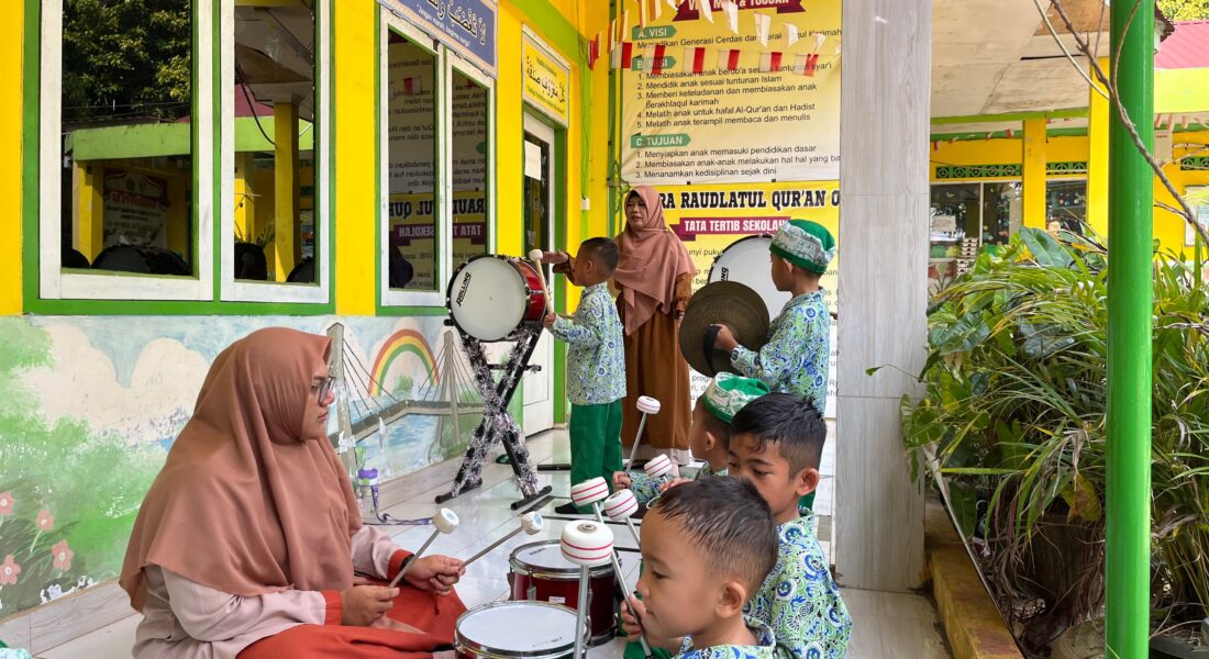 Siswa RA Raudlatul Qur’an 01 Batam belajar memainkan alat musik sederhana dengan penuh antusias didampingi oleh guru.
