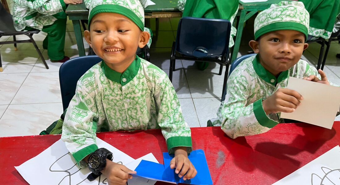 Terlihat dua peserta didik RA Raudlatul Qur’an Batam 01 sedang mengikuti kegiatan seni potong-tempel dengan wajah ceria. Mereka memegang potongan kertas warna-warni sambil mengisi pola gambar yang tersedia, menunjukkan antusias dan semangat belajar yang tinggi.Keceriaan peserta didik RA Raudlatul Qur’an Batam 01 kembali terlihat dalam kegiatan pembelajaran hari ini. Anak-anak tampak antusias mengikuti aktivitas seni potong-tempel (collage) yang menjadi bagian dari program pengembangan kreativitas di madrasah.