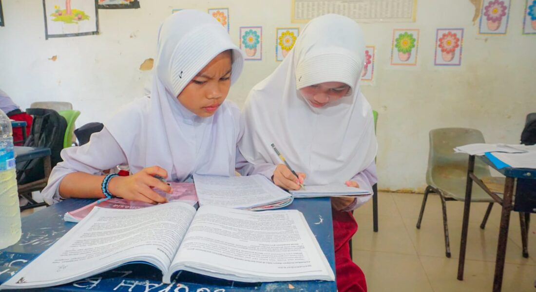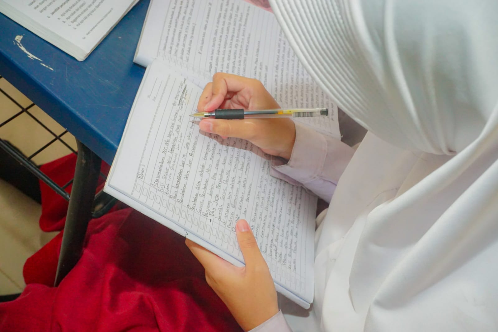 Foto Siswa MI Raudlatul Qur’an Batam sedang menulis pelajaran dengan penuh konsentrasi.