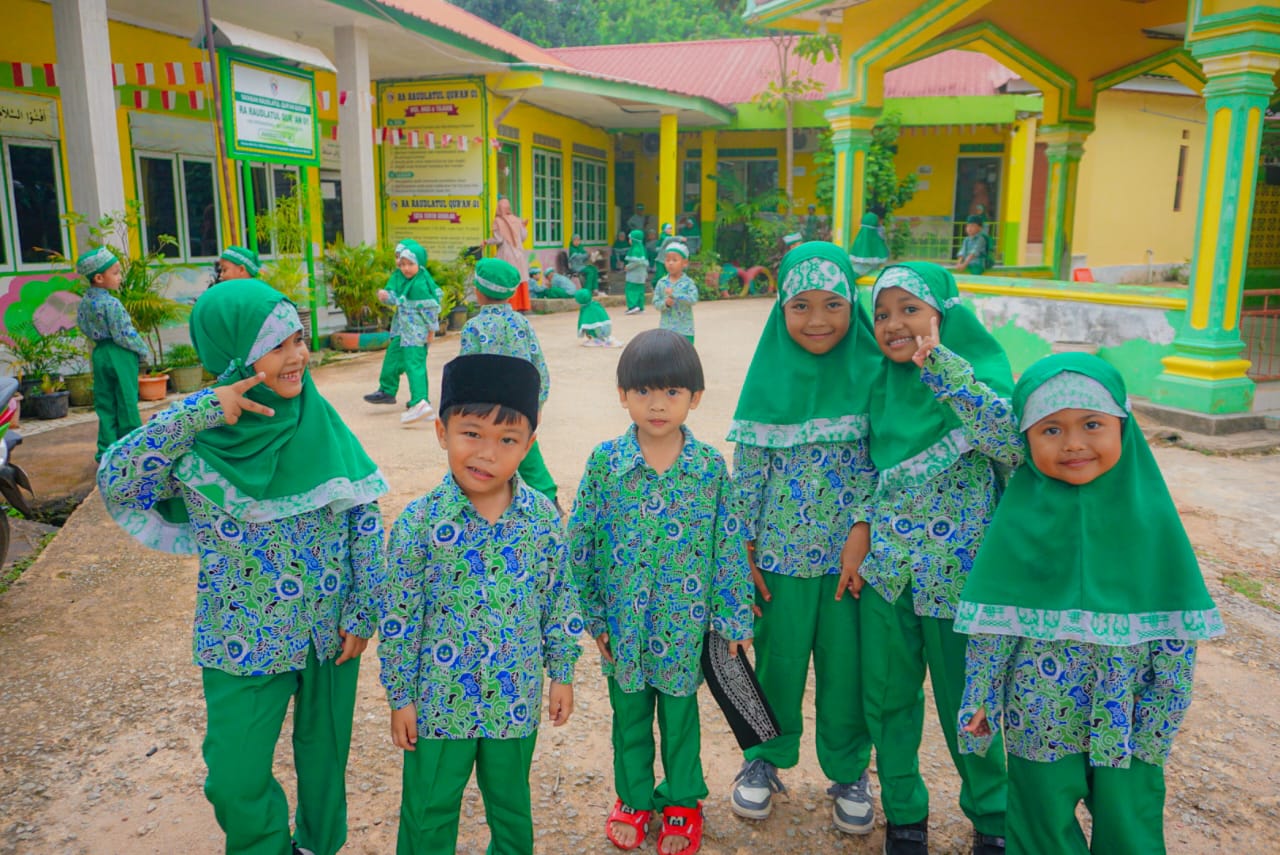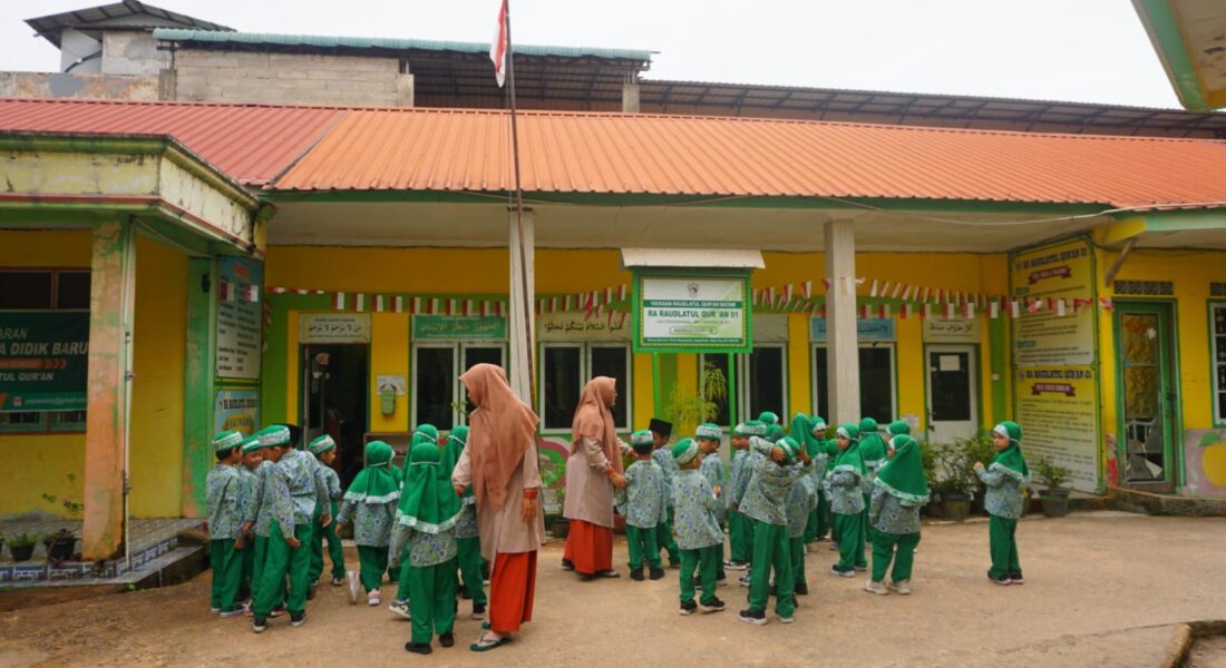 Foto Anak-anak RA Raudlatul Qur’an 01 Batam berbaris rapi sebelum kegiatan belajar dimulai.