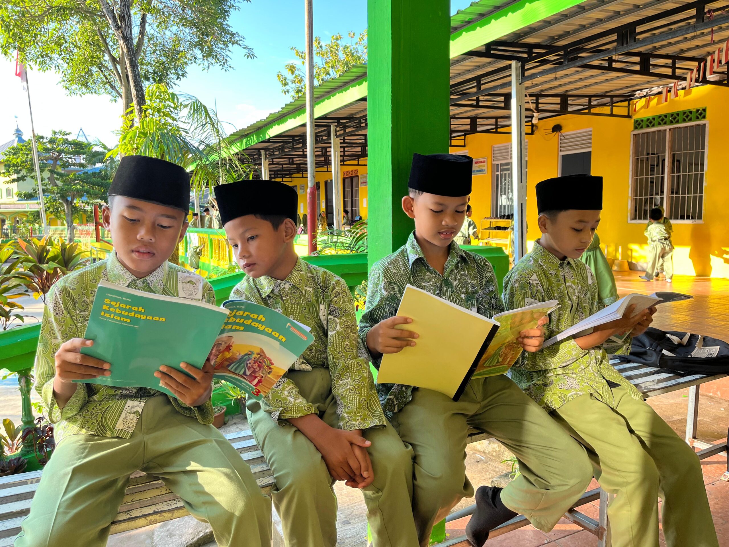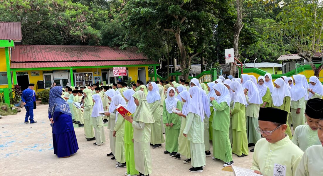 Siswa-siswi MI Raudlatul Qur’an Batam berbaris rapi di halaman sekolah sambil membaca juz amma.