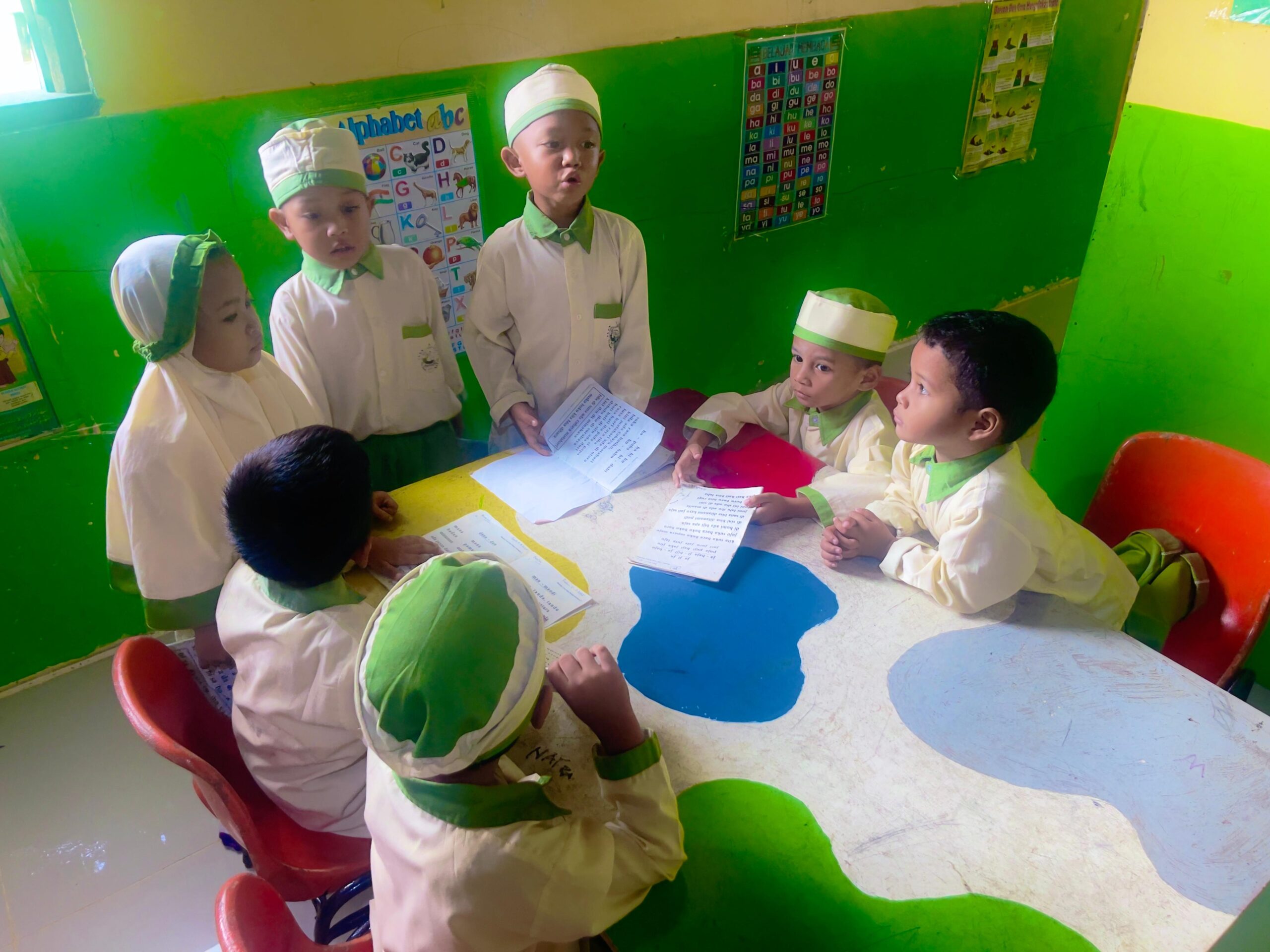 Pembiasaan merapikan barang, antri, sopan santun, kerja sama, dan keberanian tampil menjadi bagian penting dalam keseharian.