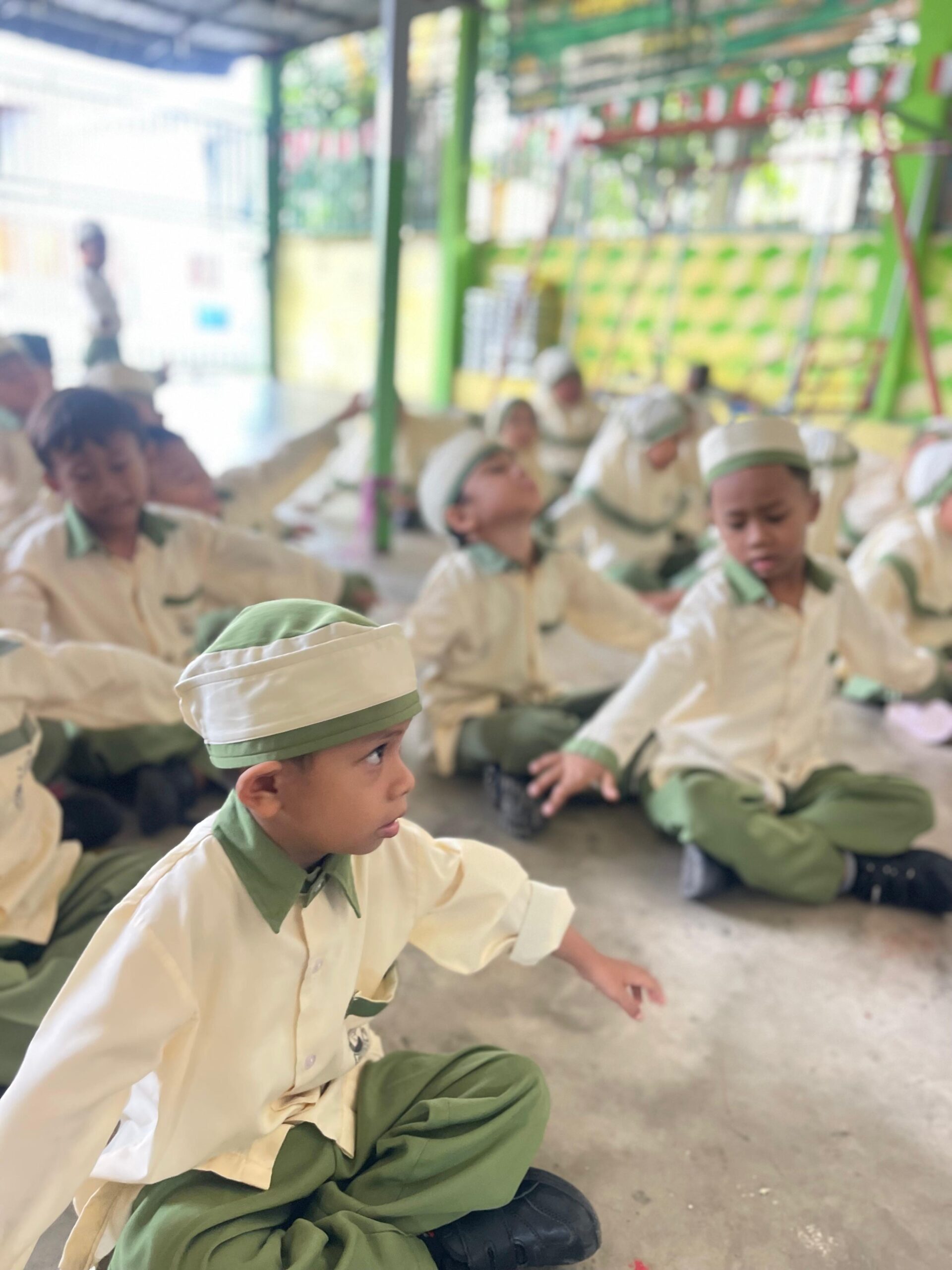 Suasana pembelajaran yang ceria terlihat ketika para siswa melakukan aktivitas gerak terarah. Anak-anak tampak fokus mengikuti instruksi, menunjukkan antusiasme dalam kegiatan belajar yang interaktif.
