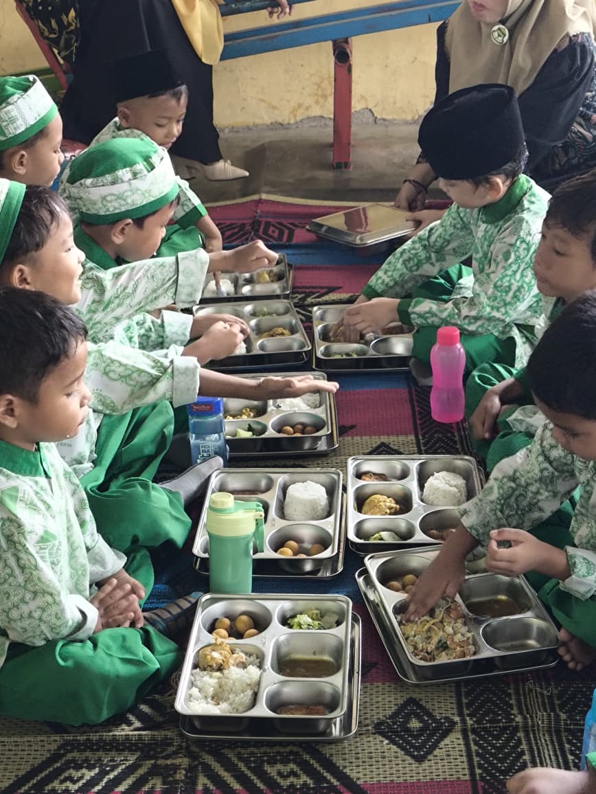 Anak-anak RA Raudlatul Qur’an 2 Sagulung Batam sedang mengikuti kegiatan makan bersama sebagai bagian dari pembiasaan adab, seperti berdoa, makan dengan tertib, dan saling berbagi dalam suasana penuh kebersamaan.