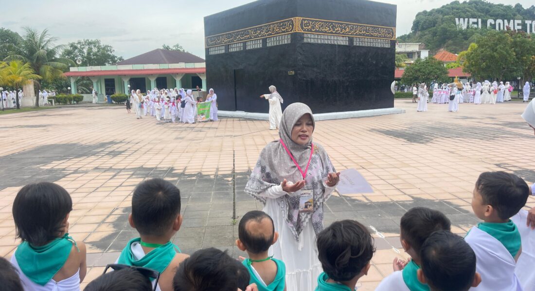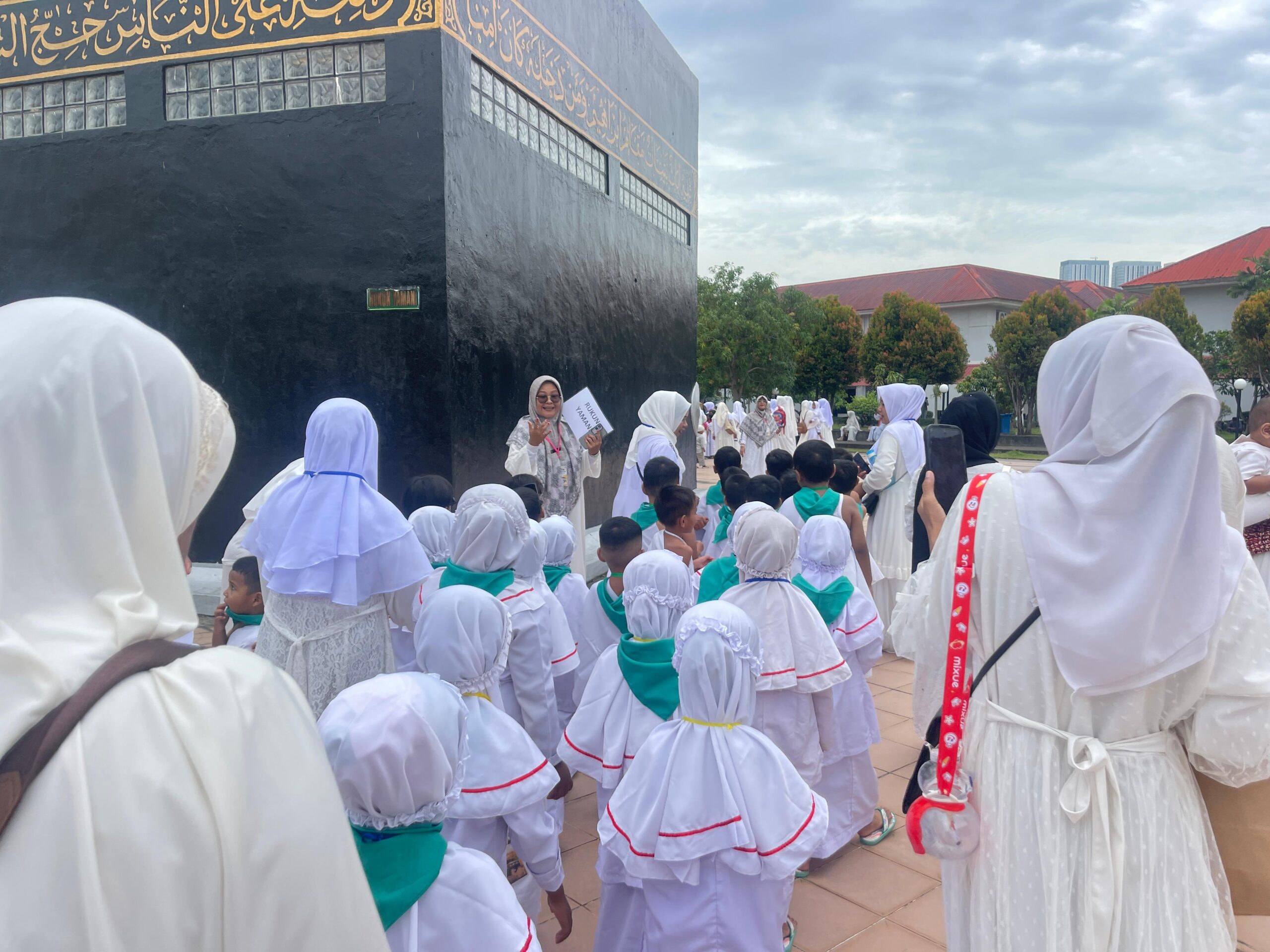 Anak-anak tampil mengenakan pakaian ihram putih lengkap dengan atribut hijau sebagai penanda kelompok. Dengan bimbingan para guru, mereka belajar tata cara pelaksanaan ibadah haji, mulai dari niat, thawaf mengelilingi Ka’bah, hingga lempar jumrah. Kegiatan ini tidak hanya memberikan pengalaman belajar yang menyenangkan, tetapi juga memperkuat pemahaman anak-anak tentang rukun Islam kelima.