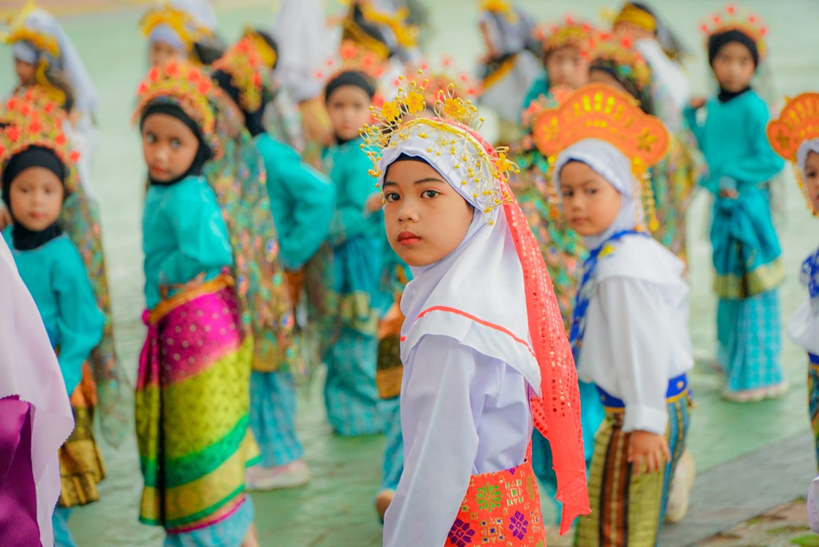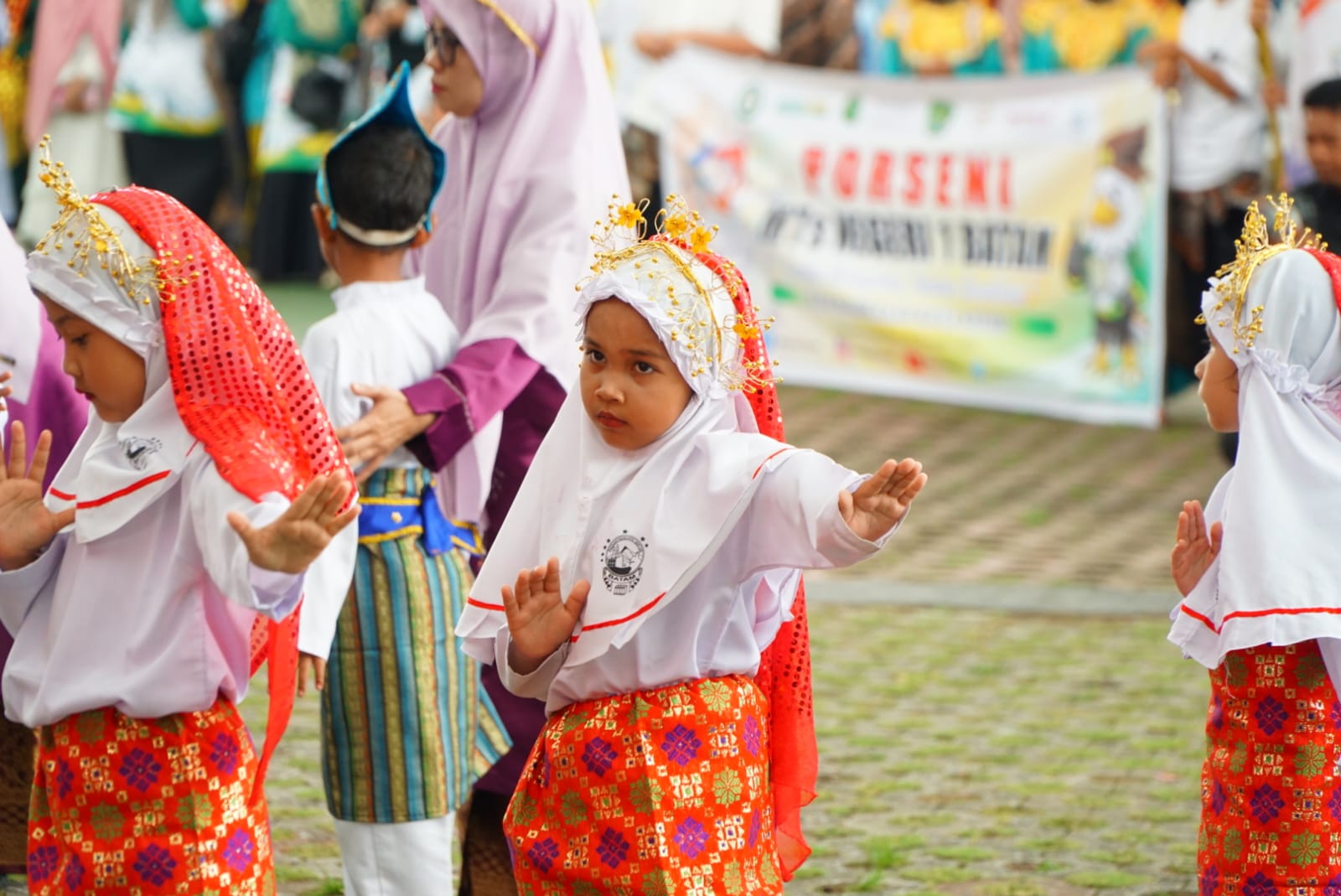 Ekspresi antusias dan keceriaan anak-anak saat menari menjadi momen berharga yang menggambarkan semangat cinta budaya dan kebersamaan.