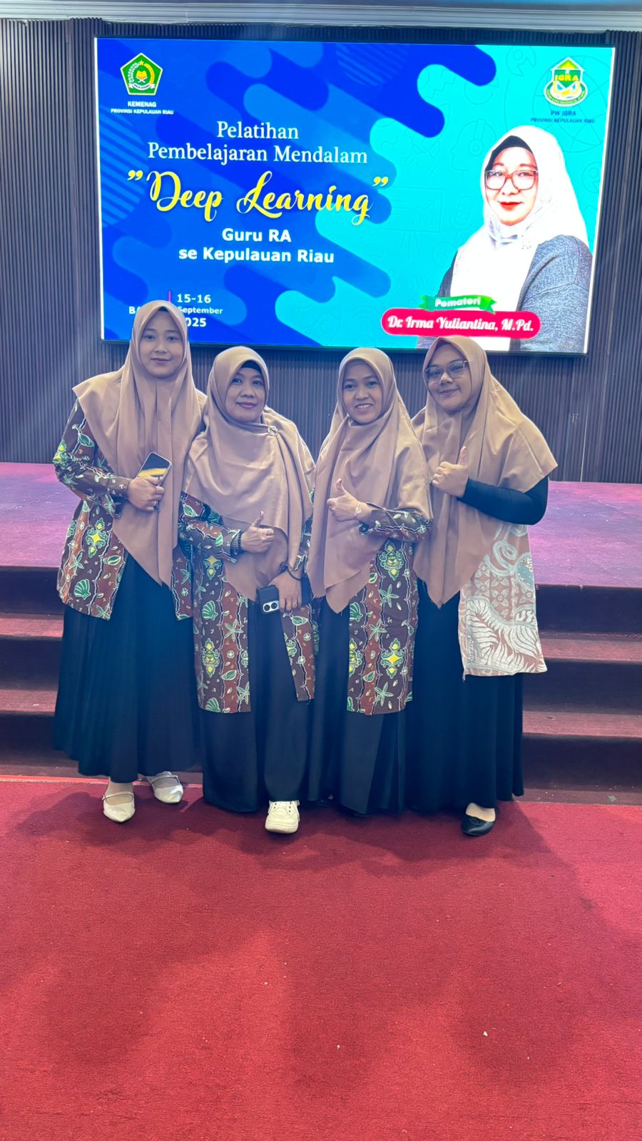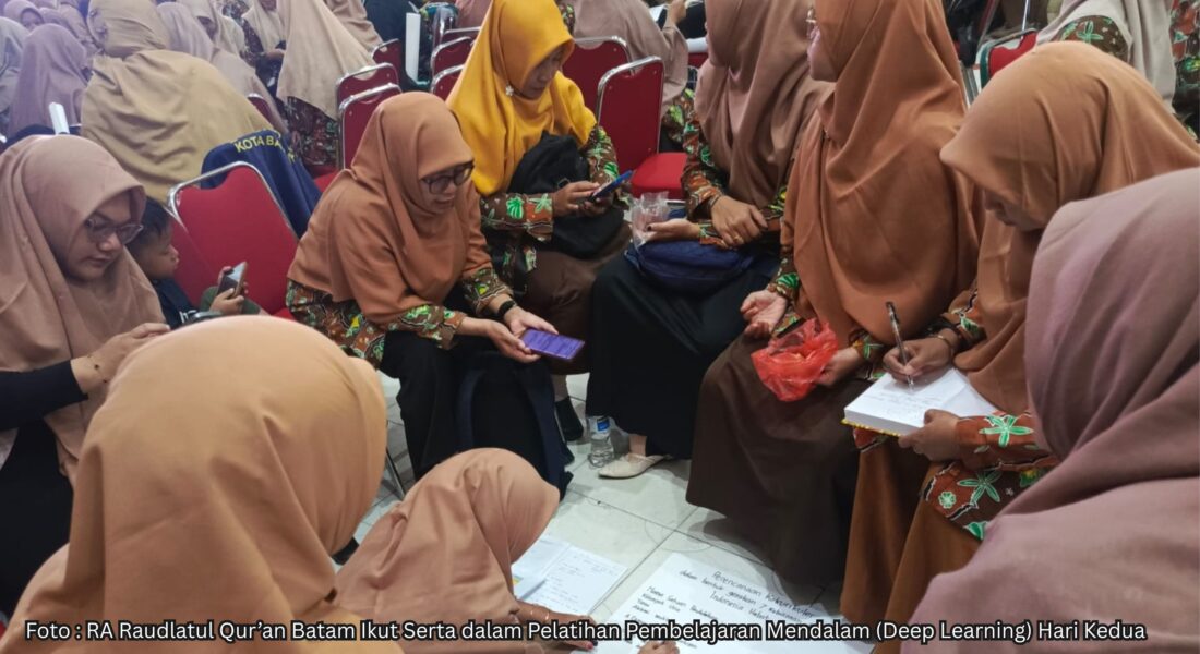 Kepala sekolah dan para guru RA Raudlatul Qur’an Batam 01 mengikuti Pelatihan Pembelajaran Mendalam (Deep Learning) hari kedua yang diadakan untuk seluruh guru RA se-Kepulauan Riau. Kegiatan ini merupakan bagian dari program peningkatan kompetensi pendidik yang diharapkan dapat memperkaya metode dan strategi pembelajaran di tingkat Raudhatul Athfal.