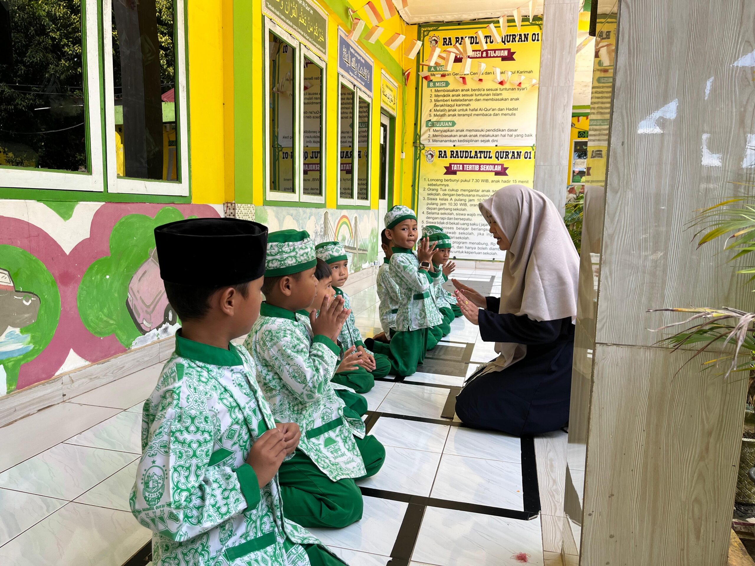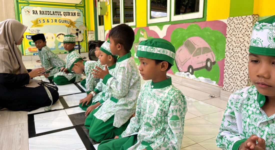 Siswa RA Raudlatul Qur’an 01 Batam duduk dengan rapi dan khusyuk mengikuti arahan guru sebelum memulai latihan, mencerminkan kedisiplinan dan kesiapan dalam belajar.Suasana hangat dan penuh keceriaan menyelimuti lingkungan RA Raudlatul Qur’an 01 Batam saat para siswa mengikuti kegiatan latihan menari yang dilaksanakan di area sekolah. Dengan balutan seragam bernuansa hijau yang rapi, anak-anak tampak duduk berbaris dengan tertib, menunjukkan kesiapan mereka dalam menerima arahan dari guru.