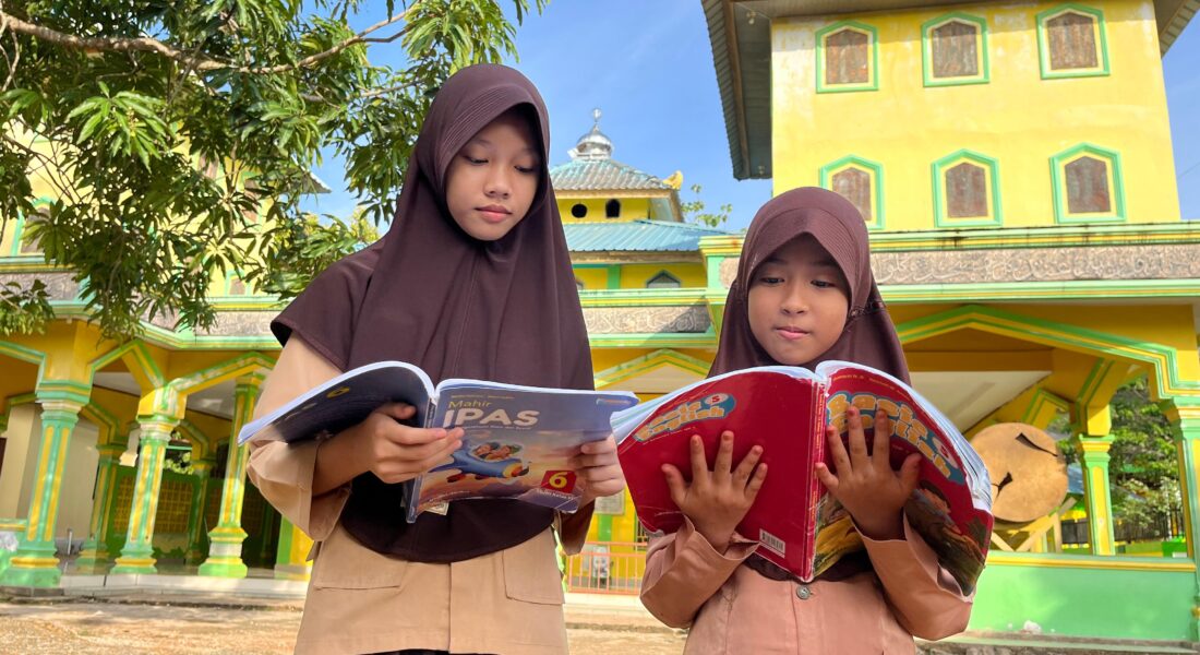 Dua siswi MI Raudlatul Qur’an Batam sedang membaca buku pelajaran di lingkungan sekolah, menunjukkan semangat literasi dan budaya belajar di luar kelas.