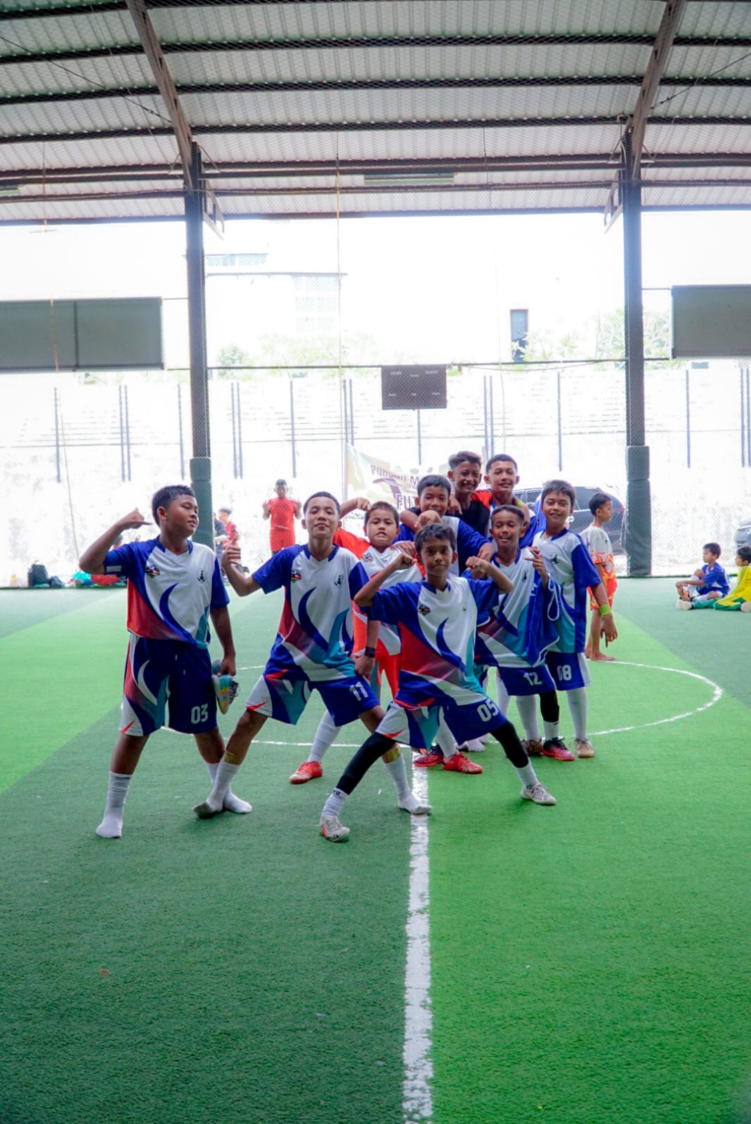 Tim Futsal MI Raudlatul Qur’an berpose setelah pertandingan dimulai.