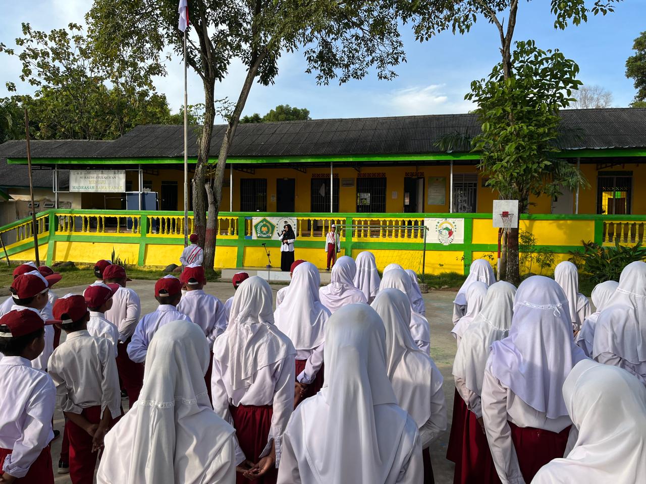Foto : Tampak para murid MI Raudlatul Qur’an Batam sedang berbaris mengikuti kegiatan upacara bendera